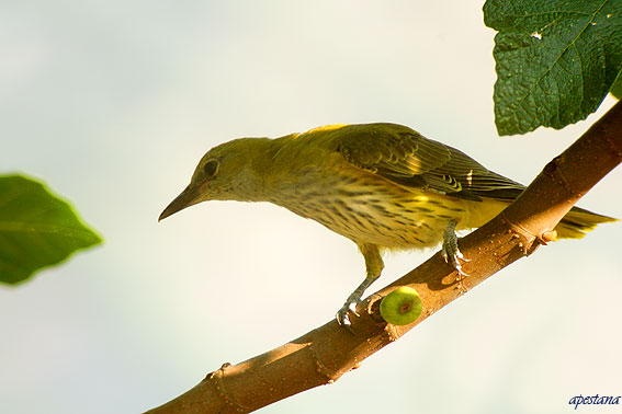 "Siente verdadera predilección por las cerezas y los higos, siendo estos árboles puntos muy buenos para su observación durante el periodo estival, que pasan en la Península Ibérica. Su llamativo color amarillo y negro las hace una de las aves más bonitas de nuestros sotos".
